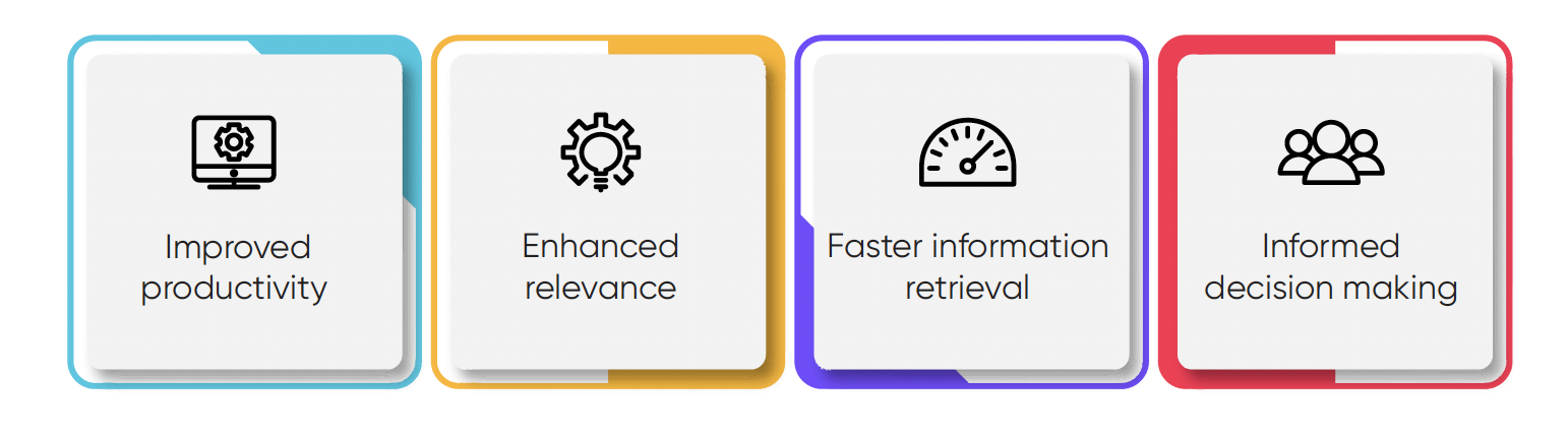 Improved productivity: According to a report by IDC, the knowledge worker spends about 2.5 hours per day, or roughly 30% of the workday, searching for information. Another report by McKinsey talks about how a searchable record of knowledge can reduce, by as much as 35%, the time employees spend searching for company information. The capacity to enhance time management skills is a significant advantage, and Enterprise Search can empower users to achieve unparalleled productivity.